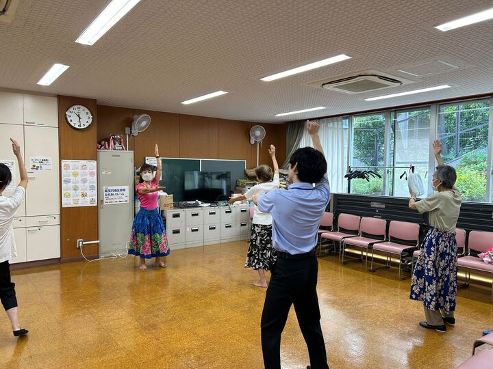 フラダンスの衣装をつけて、ブルーハワイの音楽に合わせ、皆さま素敵に踊っていらっしゃいました。