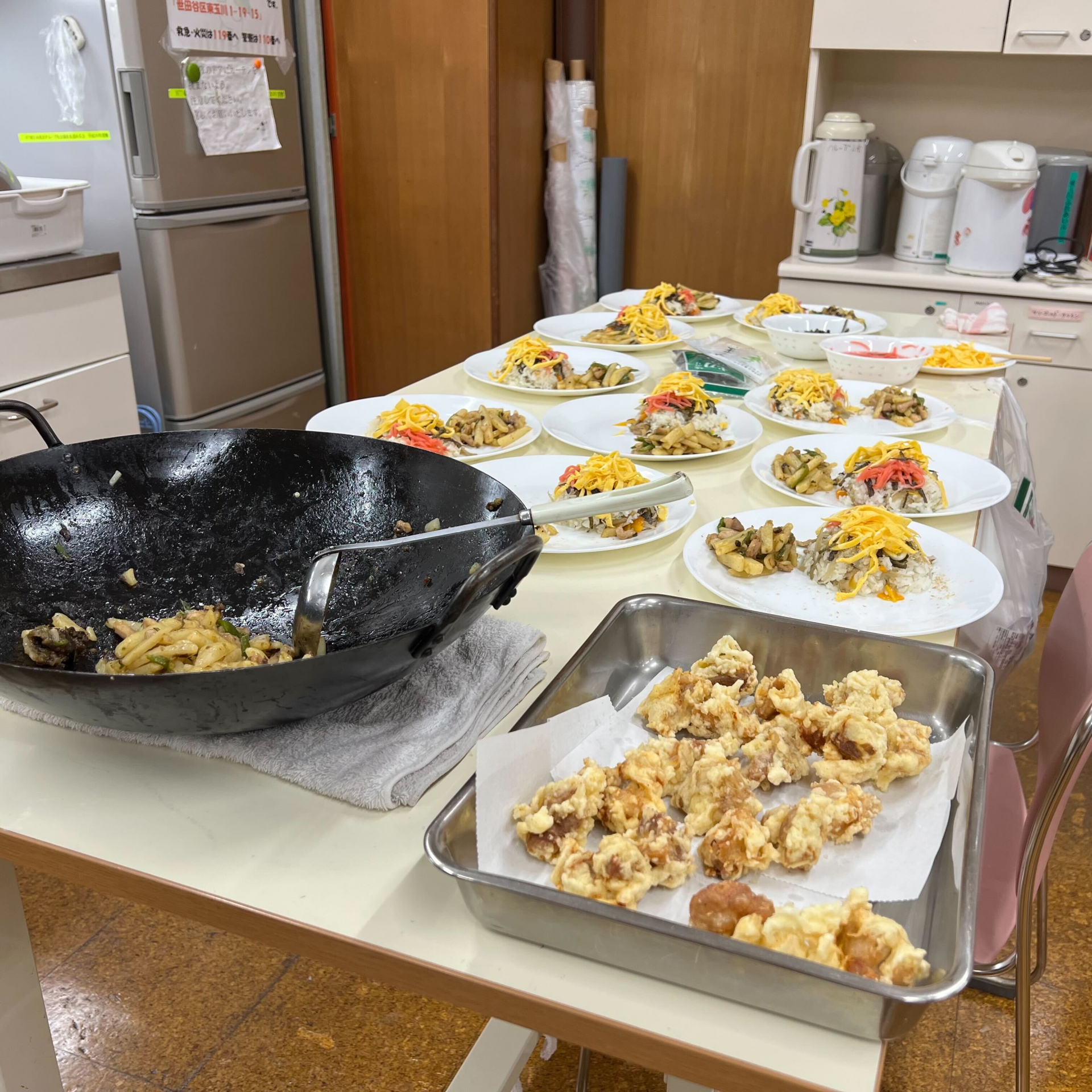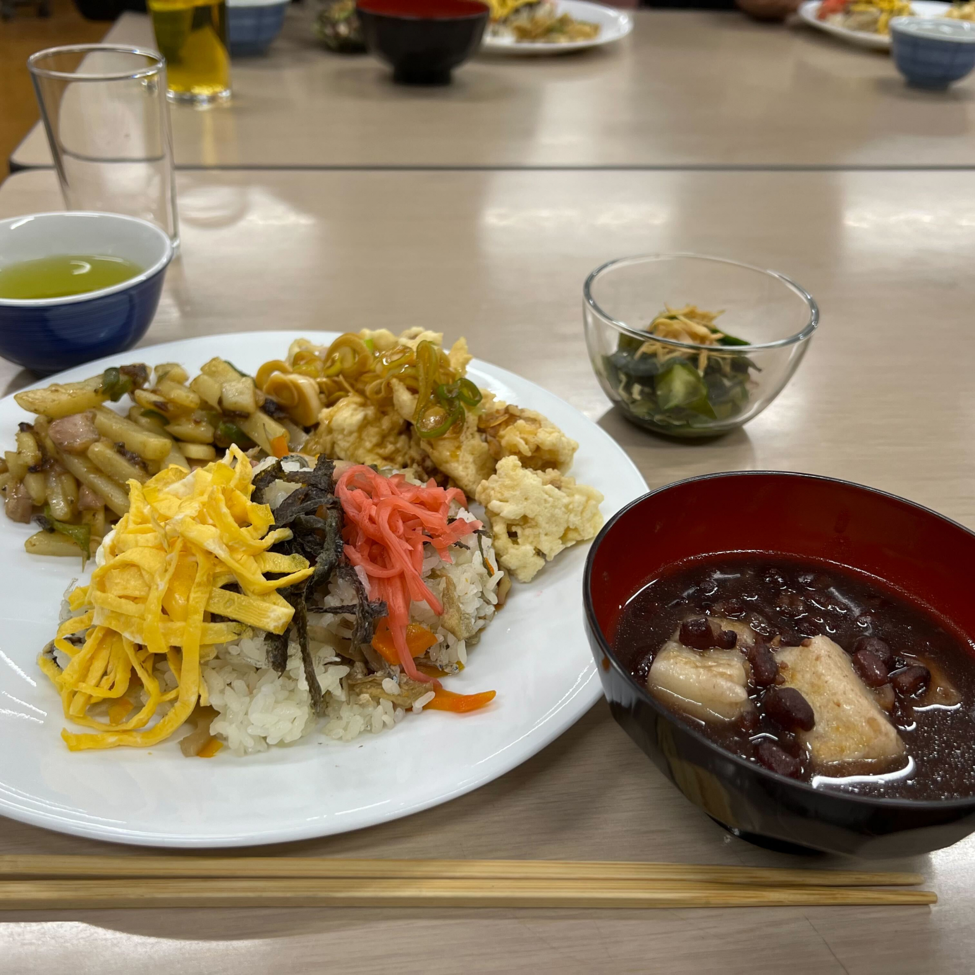 メニューは、「ちらし寿司」「ネギだれ付きとり天」、「鶏肉じゃがいものチンジャオロース」、「キュウリの酢の物」、「ぜんざい」