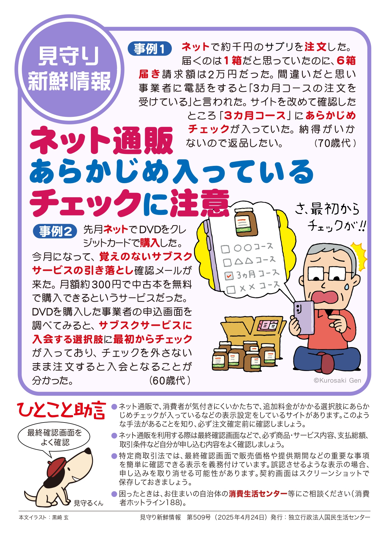 ネット通販で、消費者が気付きにくいかたちで、追加料金がかかる選択肢にあらかじめチェックが入っているなどの表示設定をしているサイトがあります。このような手法があることを知り、必ず注文確定前に確認しましょう。