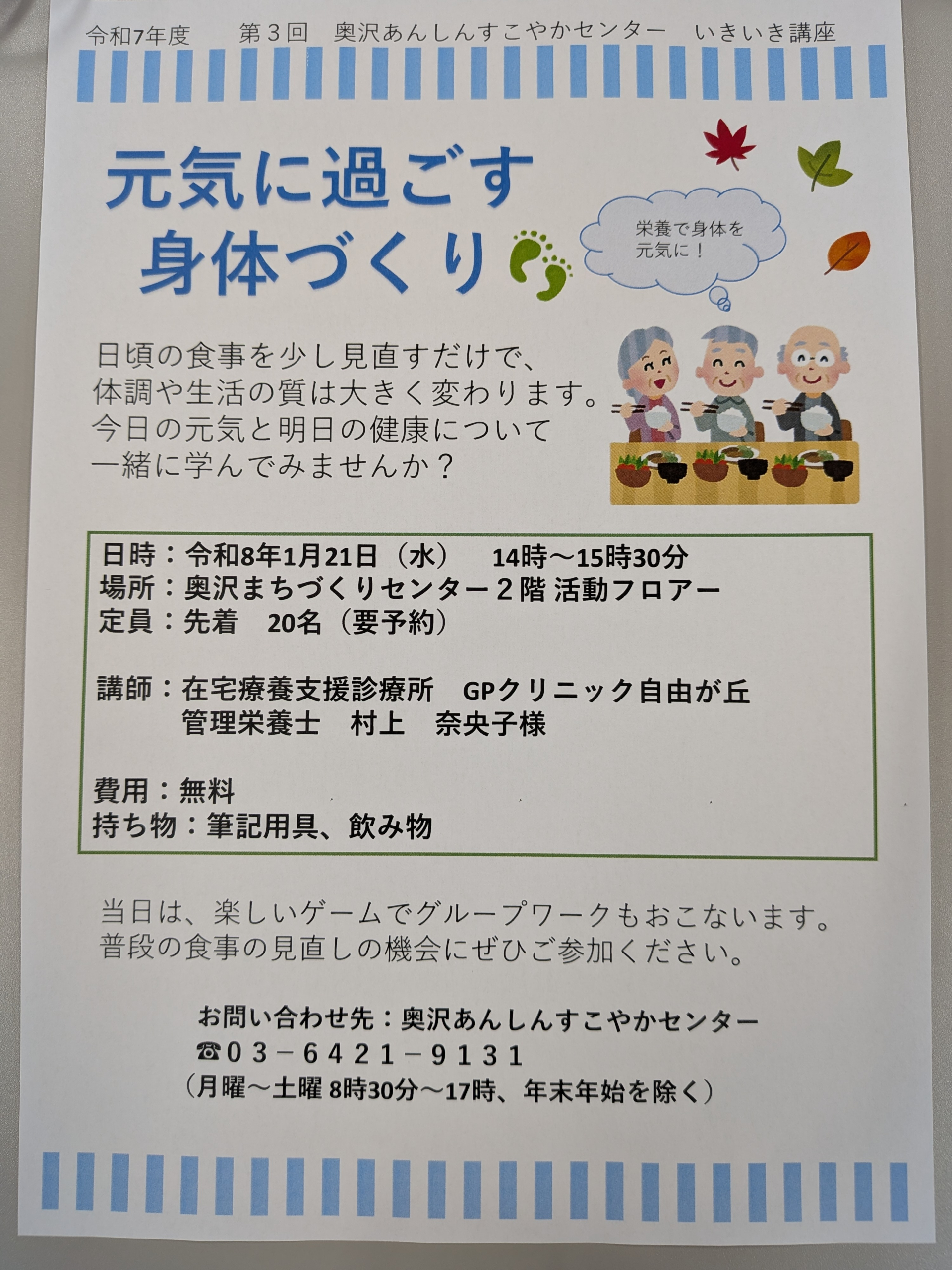 1月21日(水)14:00~奥沢まちづくりセンター2階活動フロアにて今年度3回目のいきいき講座を