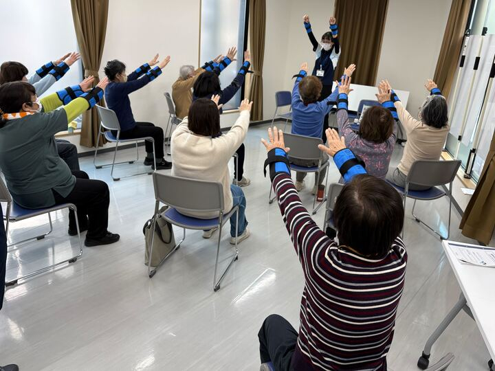 おもりの有無はお身体の状態に合わせて、水分摂取しながら全身を動かしました。
