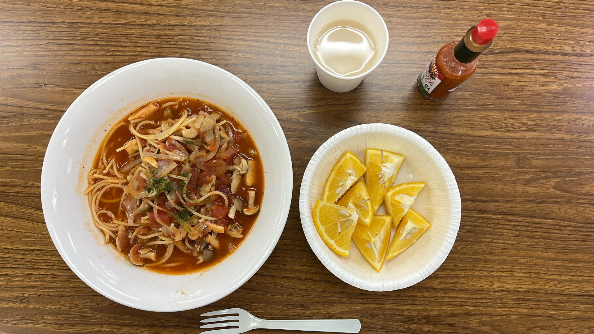お昼ごはんはペスカトーレと夏みかんでした。魚介のうまみたっぷりで美味しかったです。