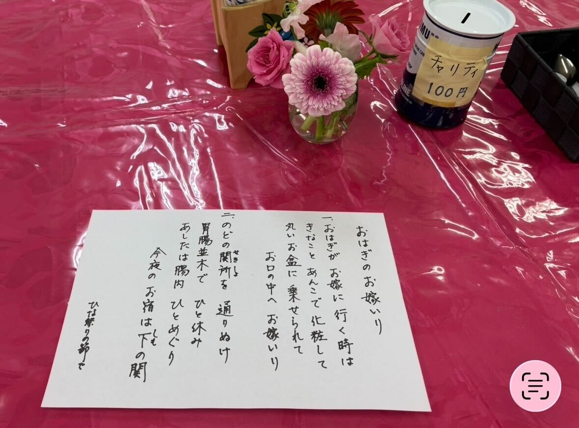 皆さんで"うれしいひなまつり"を歌った後は、うれしいひなまつりの替え歌で"おはぎのお嫁入り"を歌いました。ユーモアたっぷりの歌詞で、歌い終わった後は皆さん笑い合っていました♪