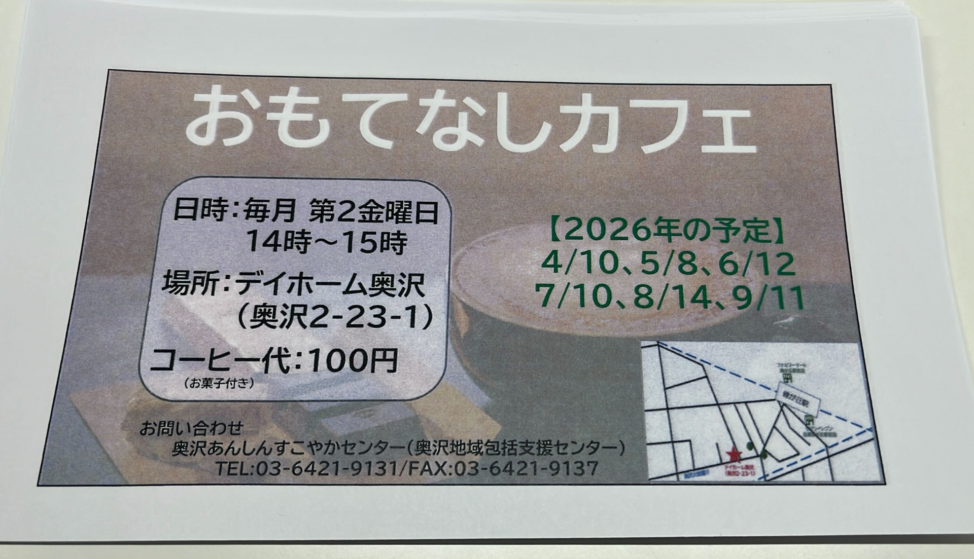 毎月第二金曜日の午後は、デイホーム奥沢1階のカフェスペースで「おもてなしカフェ」を開催しています。