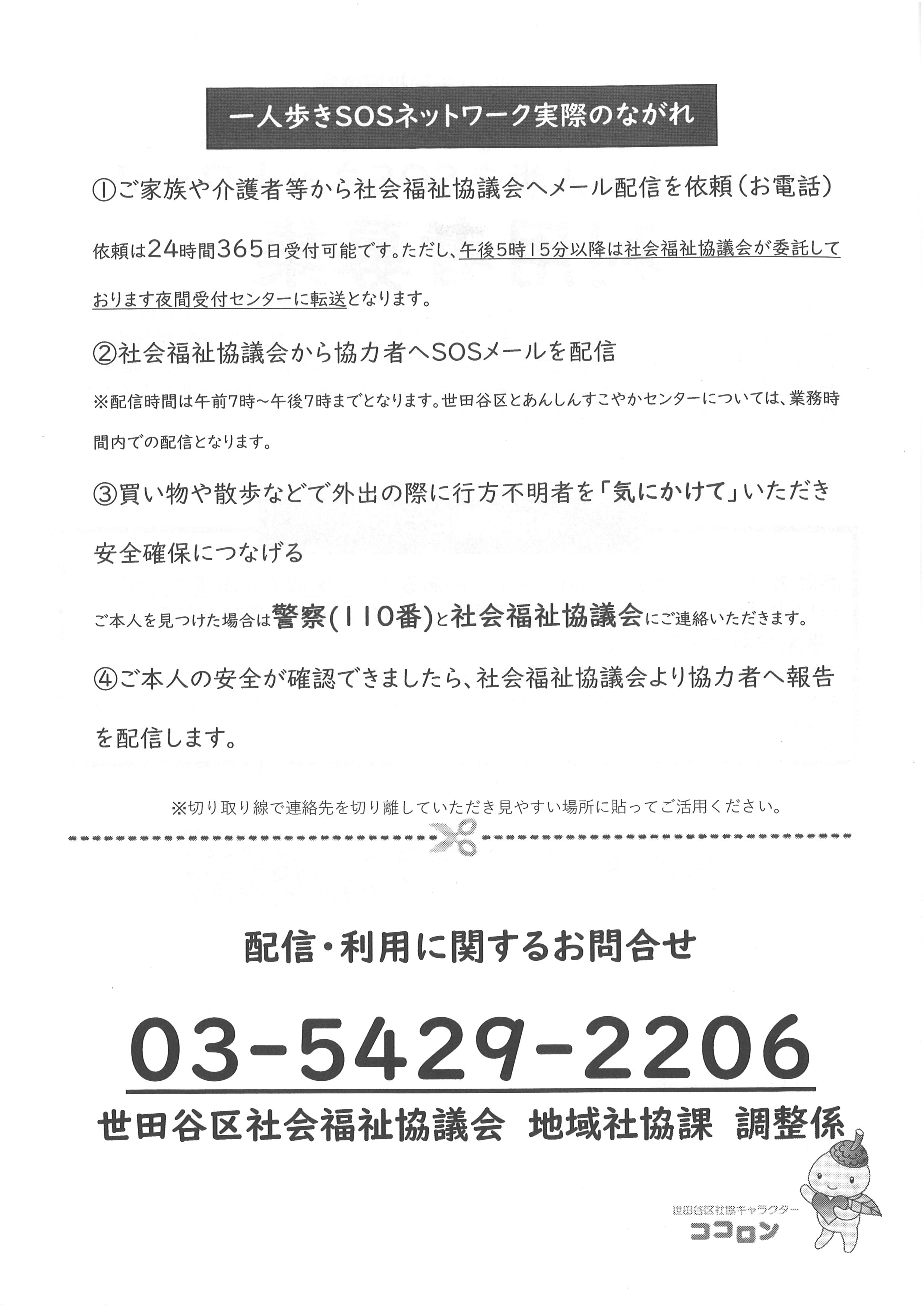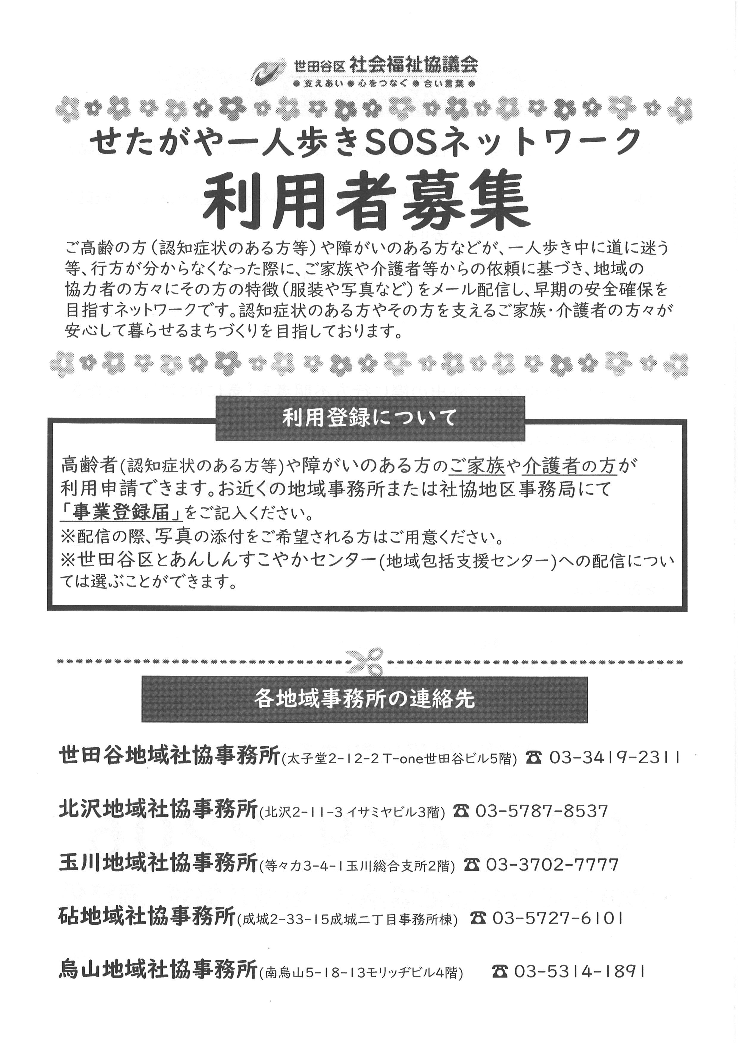 世田谷区では、認知症や障害をお持ちの方がお一人で外出し、ご自宅に戻れなくなってしまった際、登録していただいている方にメールが配信され、外出時に気にかけていただける「せたがや一人歩きSOSネットワーク」という事業があります。
