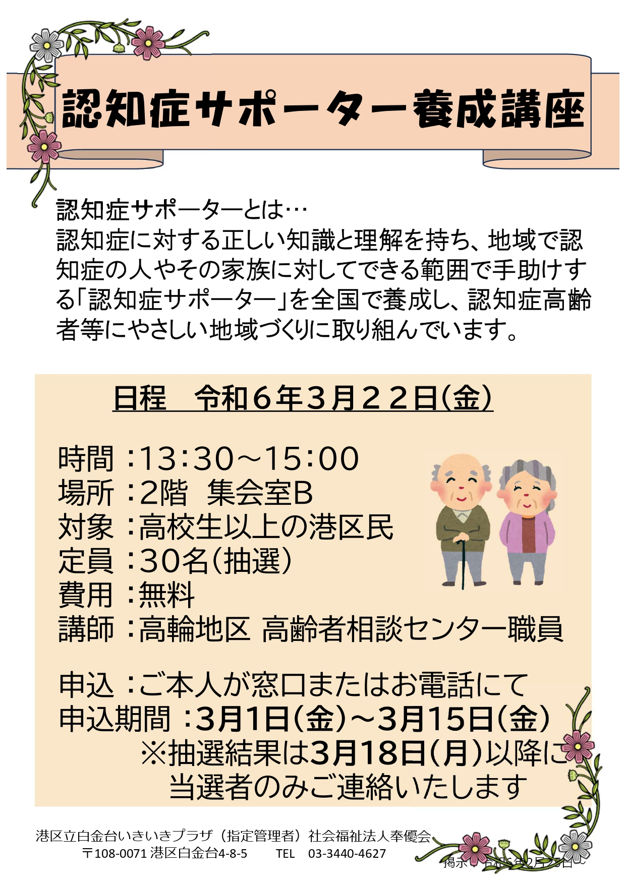 3月22日(金)、白金台いきいきプラザにて認知症サポーター養成講座を開催いたします!