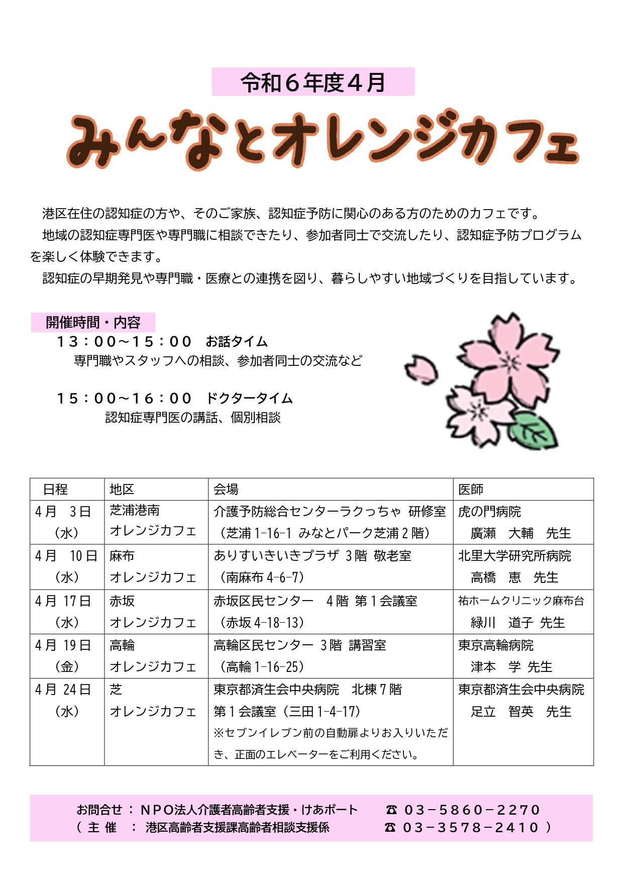 港区内の高輪地区で毎月開催している「みんなとオレンジカフェ」についてのご案内です。