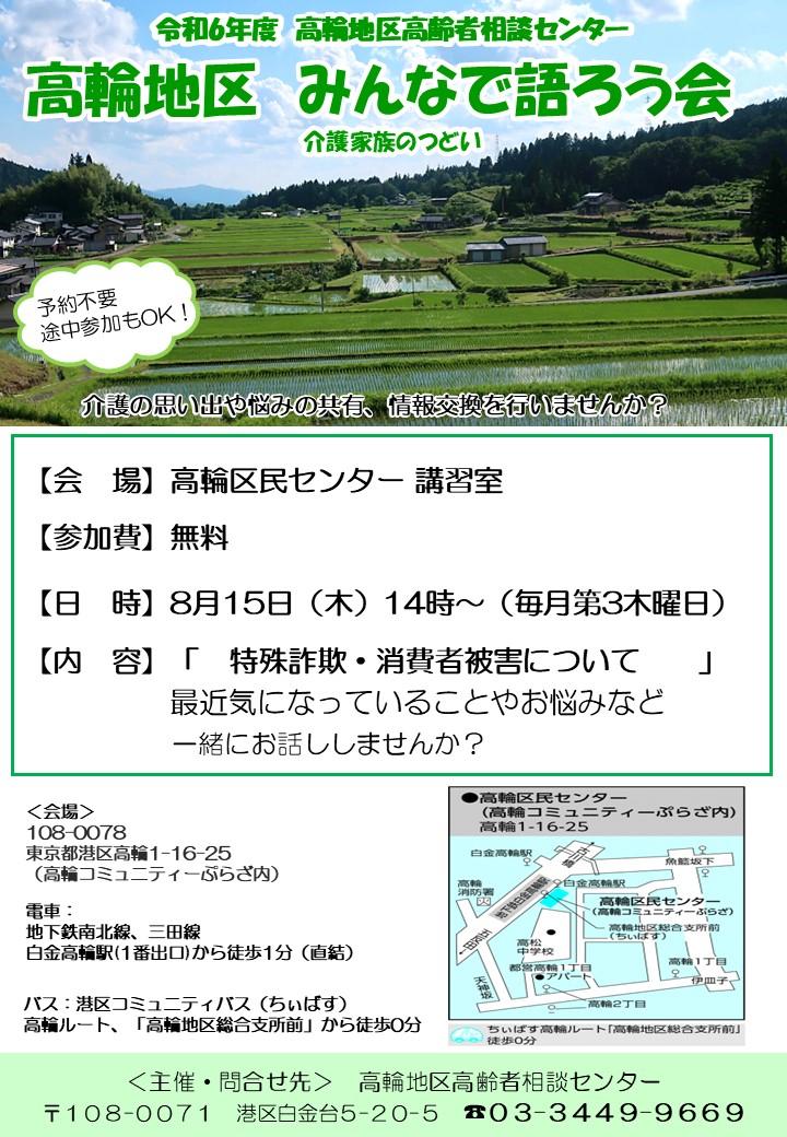 【白金包括】8月の高輪地区みんなで語ろう会(介護家族のつどい)を開催します