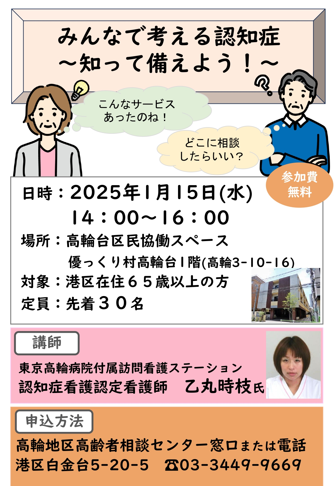 認知症とは…から、どこに相談したらよいか、港区の認知症関連サービスの紹介も予定しております。