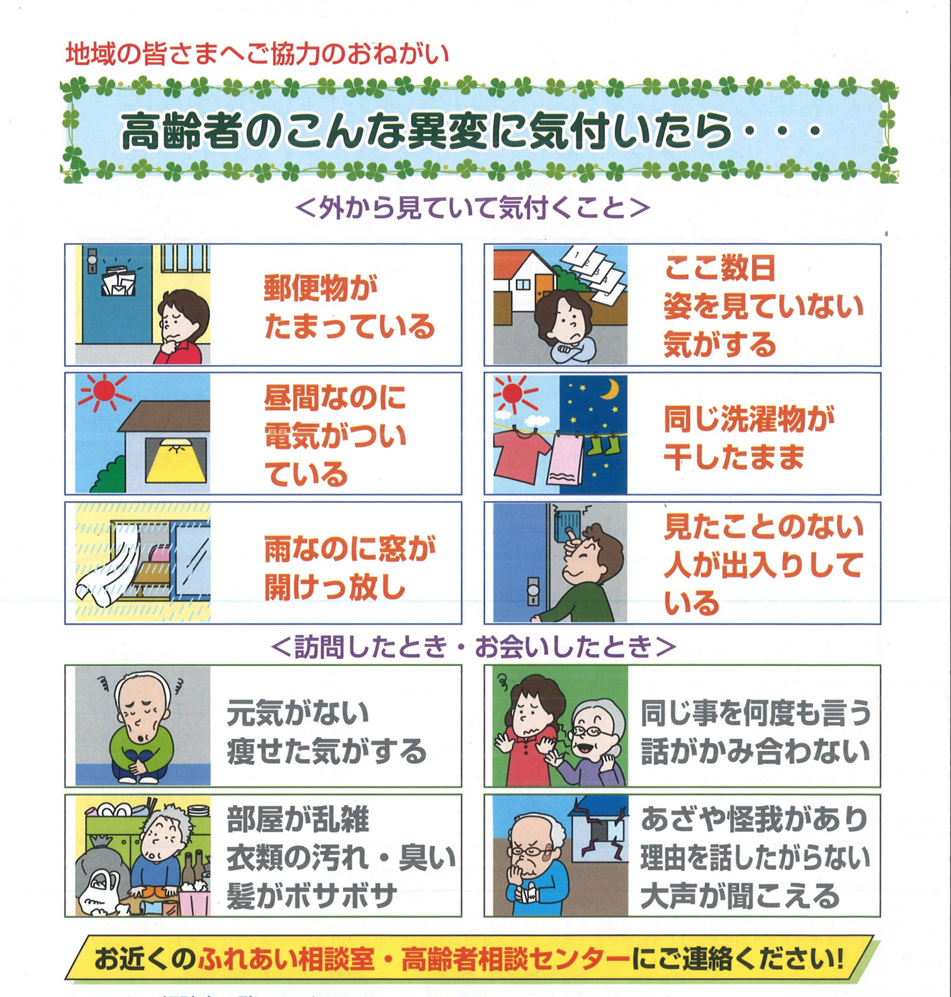 ご本人やご家族の方がどのような問題や思いを抱えているかを知り、支援に繋げるためにも、少しでもおかしいなと感じた時はまずお近くの高齢者相談センターもしくはふれあい相談室へご連絡ください。