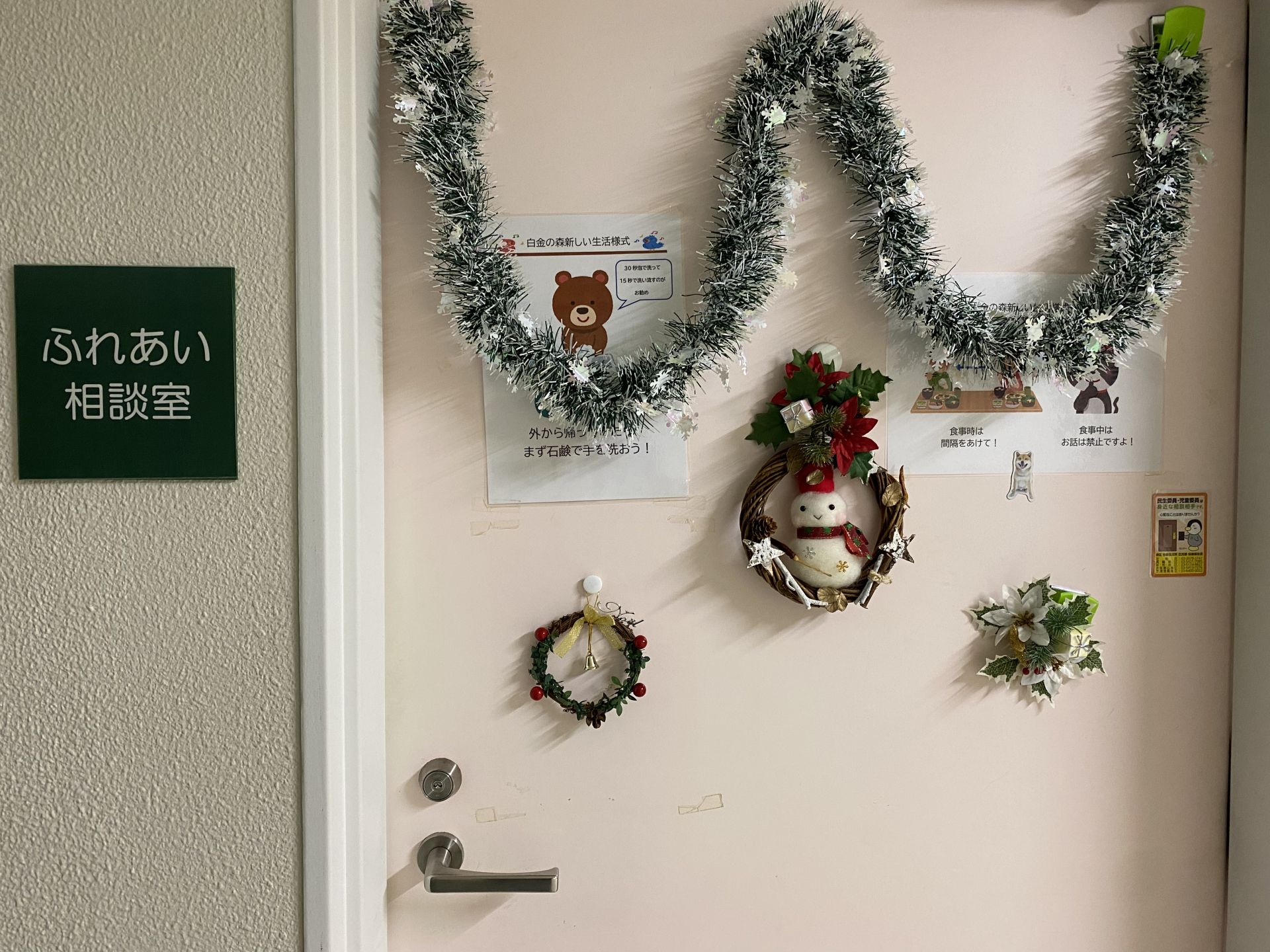 私たち、高齢者相談センターとふれあい相談室はいつもと変わらない一日ですが、しばらく前から、ふれあい相談室のドアにはこのように飾り付けをしています。