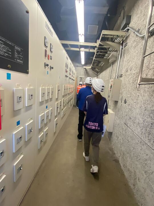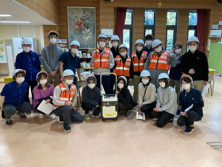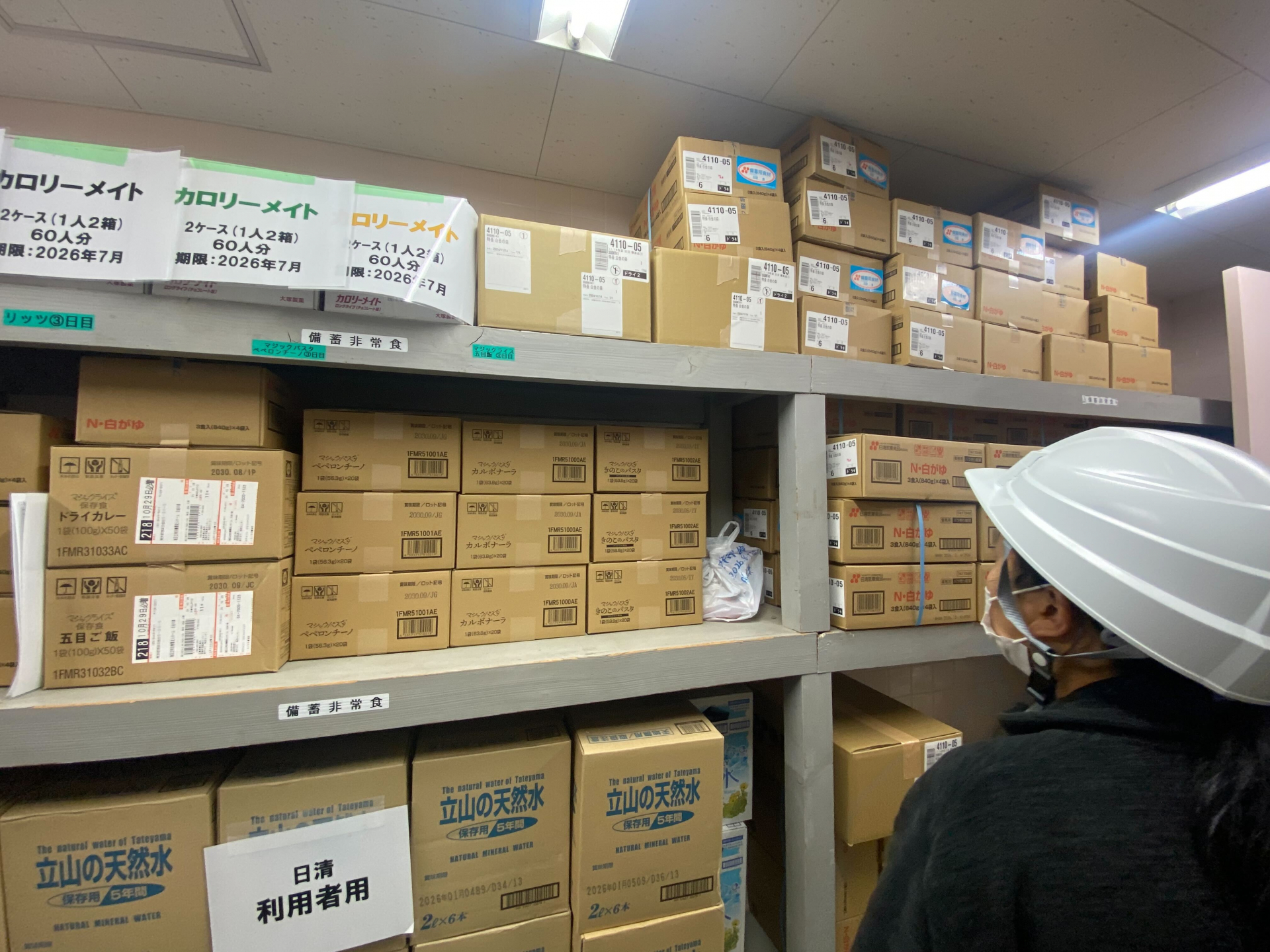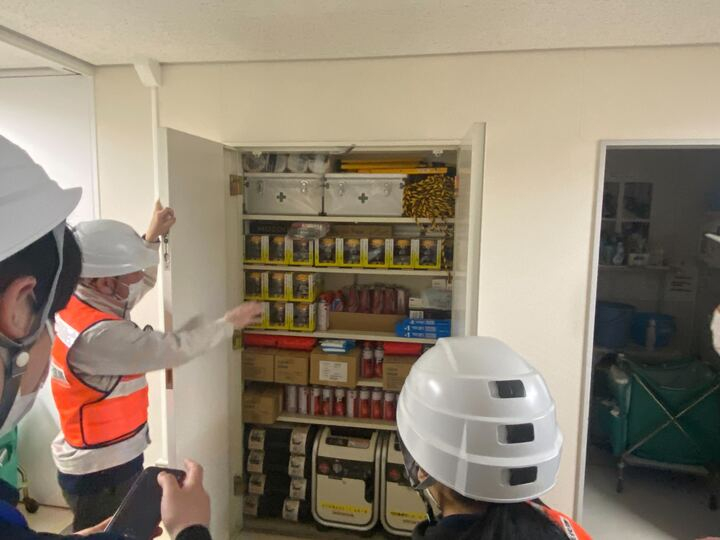 訓練ではまず、施設内の備蓄品や防災用品が置いてある場所を確認して回りました。