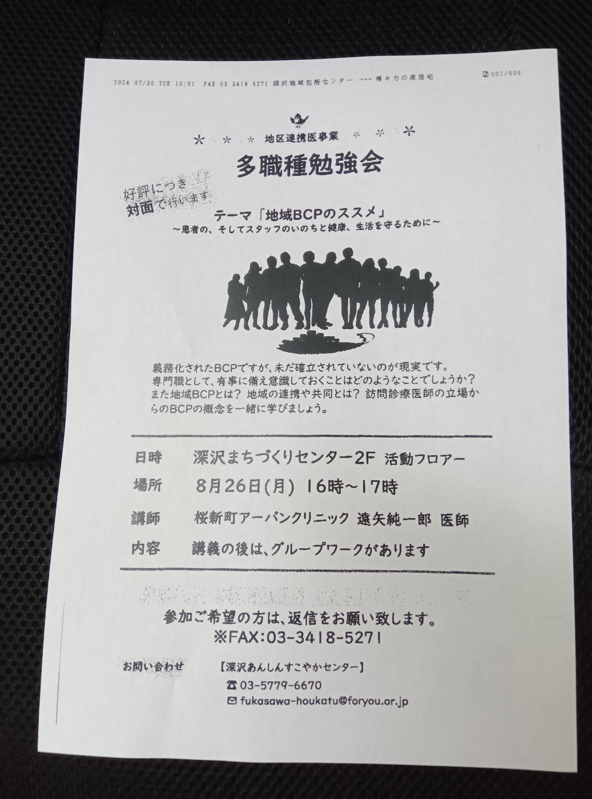 先月、深沢あんしんすこやかセンターにて地域BCPの勉強会が開催されました。