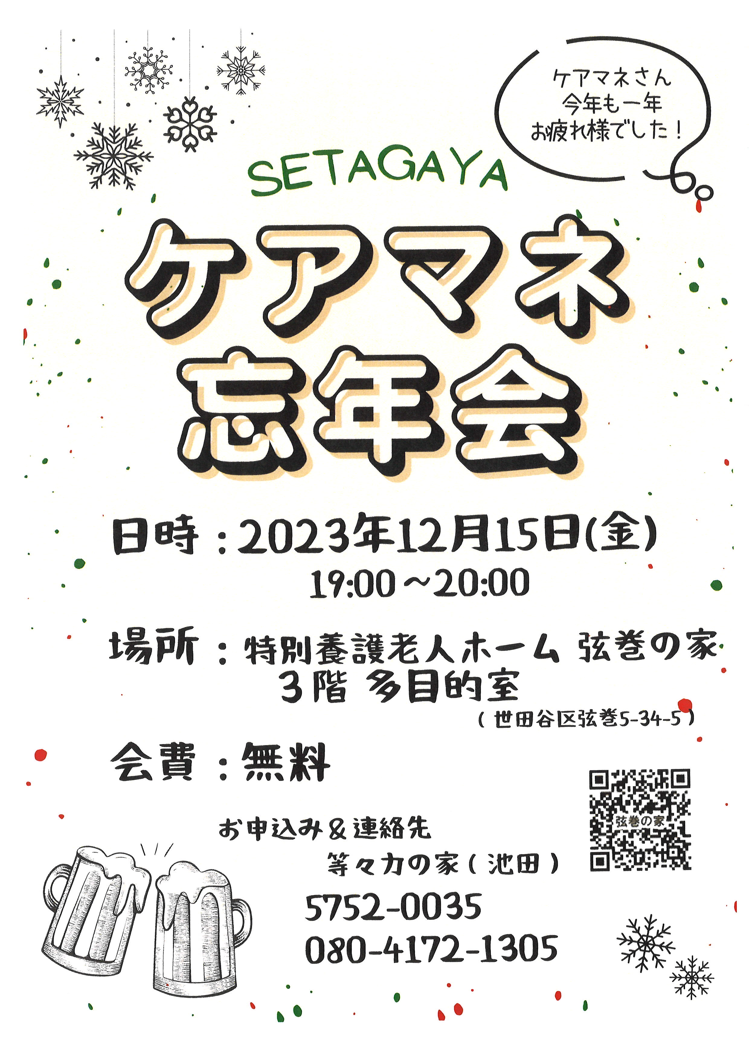 2023.12.13 お知らせ 【等々力の家居宅】ケアマネ忘年会のお知らせ Tweet シェアする 近隣のケアマネジャーさん、これからケアマネジャーを目指そうと考えている方 どうぞお気軽にご参加ください!! ご連絡、お待ちしています。 前の記事 2023.12.15 お知らせ 【等々力の家居宅】等々力の家に小学生がいらっしゃいました! 次の記事 2023.12.08 お知らせ 【等々力の家居宅】訪問リハビリの屋外歩行訓練に同行しました! 一覧へ戻る