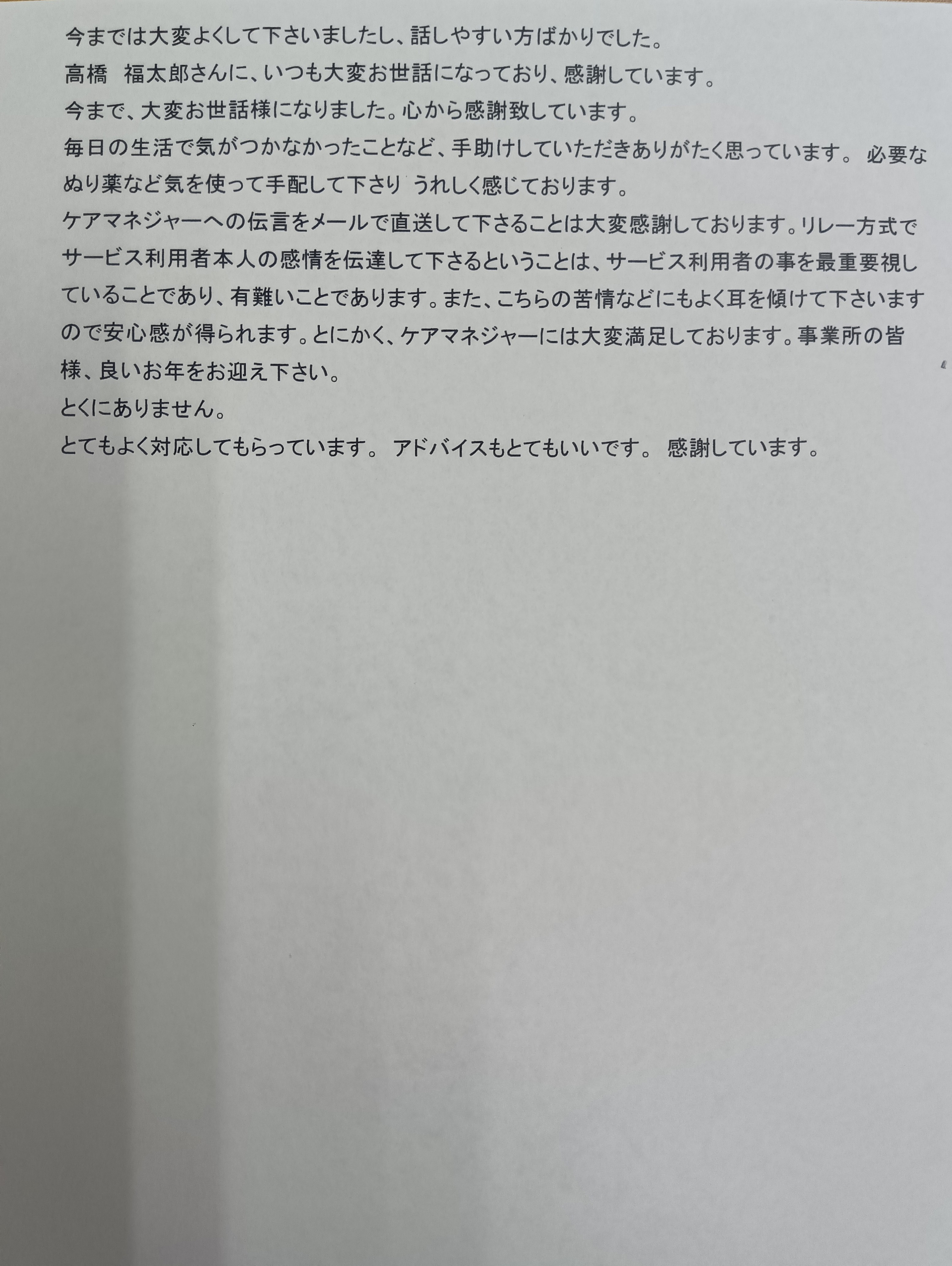 2026.01.14 活動報告 【等々力の家居宅】アンケートの結果のお知らせ Tweet シェアする 皆さん、こんにちは! 昨年、皆様にご協力いただいたアンケートの集計が完了いたしました。 皆様のお言葉を胸に今年も頑張ります! ご協力ありがとうございました! 等々力の家居宅 髙橋 前の記事 2026.01.22 活動報告 【等々力の家居宅】等々力地区多職種連絡会に参加しました! 次の記事 2026.01.13 活動報告 【等々力の家居宅】初詣に行ってまいりました! 一覧へ戻る