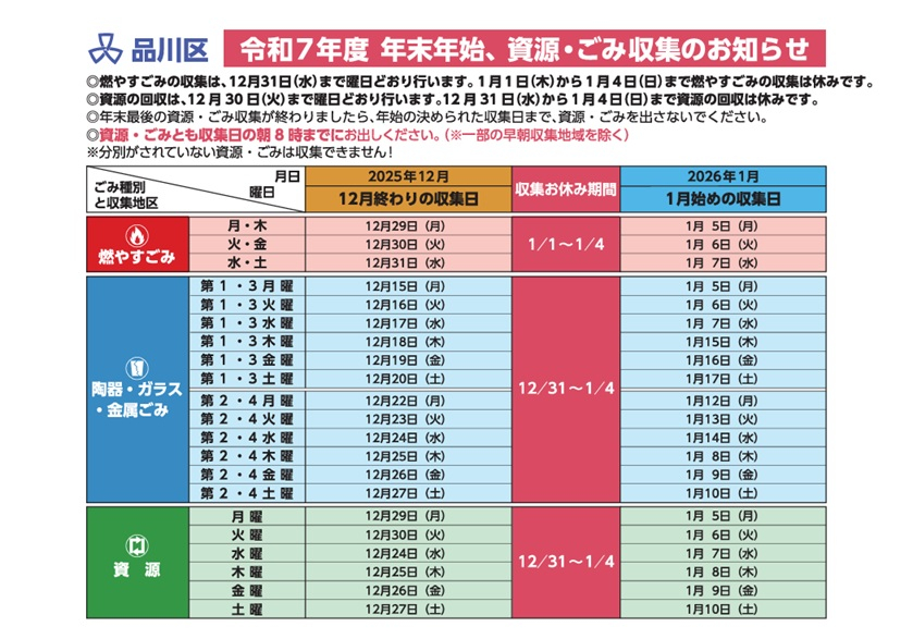 品川区より 令和7年度 年末年始の資源・ごみ収集についてのお知らせです。