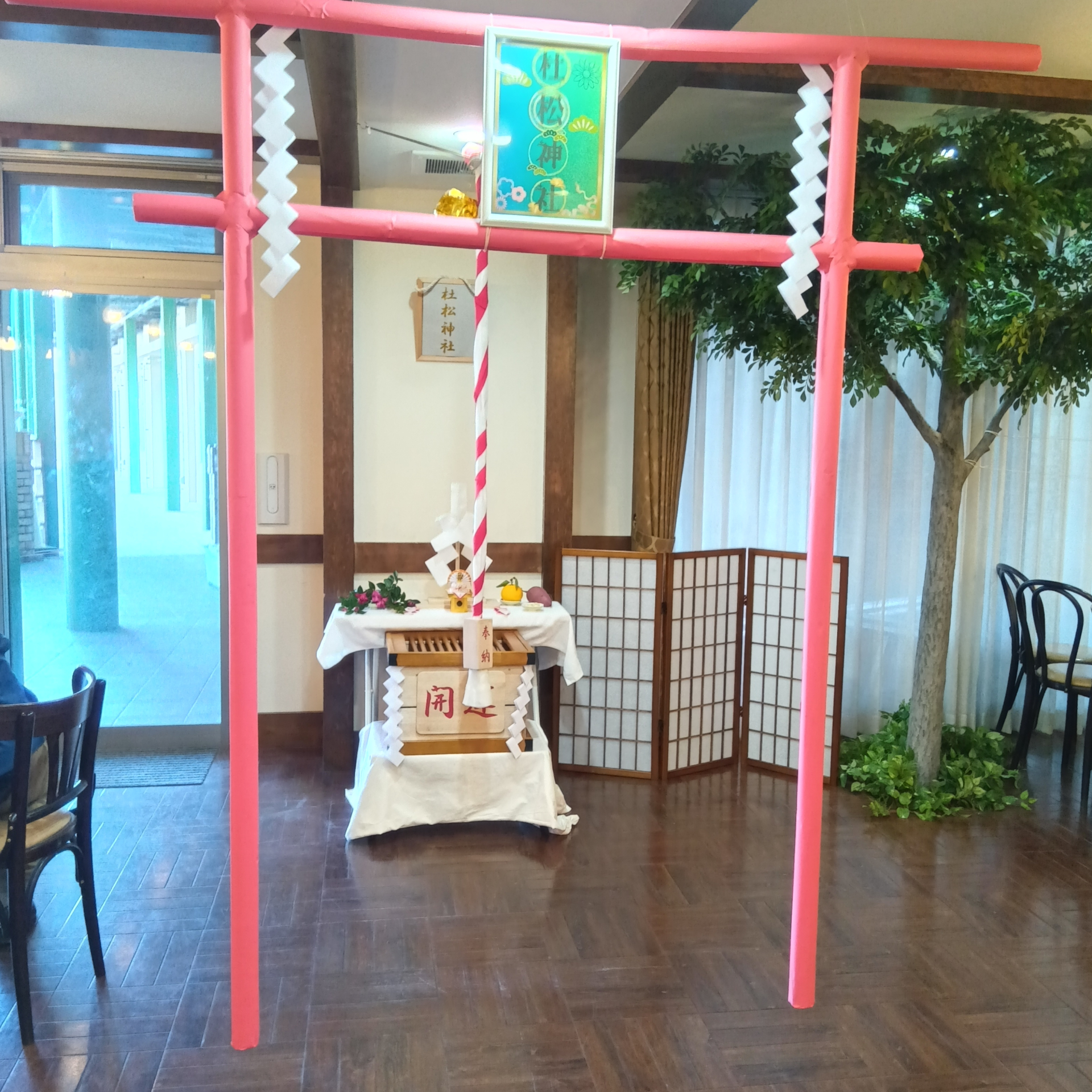 画像は杜松ホームの手作り神社です。とても立派で驚きました。