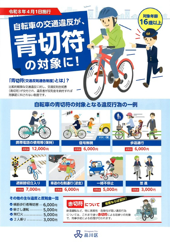 令和8年4月1日より自転車の交通違反に対して、「青切符(反則金)」が導入されます。