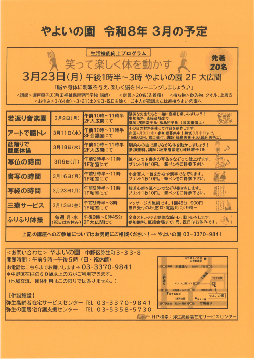 2026.02.27 黄水仙が咲いています【弥生の園居宅】 居宅介護支援事業所 2026.02.27 やよいの園 3月の予定 【弥生の園居宅】 お知らせ 2026.02.26 【弥生の園居宅】ひなまつりはもうすぐ! 居宅介護支援事業所 2026.02.17 【弥生の園居宅】ヘルパーさんの調理♪ 居宅介護支援事業所 2026.02.03 【弥生の園居宅】奉優会 事例検討会 居宅介護支援事業所 2026.01.28 【弥生の園居宅】「ケアマネはカフェにいる」カフェ取材 ニュース 2026.01.28 【弥生の園居宅】ショートステイ予約システム ニュース 2026.01.27 【弥生の園居宅】入院中の作品★ 居宅介護支援事業所 2026.01.26 【弥生の園居宅】第18回事例研究発表会のご案内 お知らせ 2026.01.14 【弥生の園居宅】玄関の装飾★ 居宅介護支援事業所 2026.01.07 【弥生の園居宅】事例研究発表会のお知らせ 居宅介護支援事業所 2025.12.24 【弥生の園居宅】オレンジカフェなごみ曜日変更のお知らせ 居宅介護支援事業所 2025.12.24 【弥生の園居宅】デイサービス・ゴールド♪クリスマスコンサート☆ 居宅介護支援事業所 2025.12.24 やよいの園 1月の予定 お知らせ 2025.12.23 【弥生の園居宅】認知症介護の電話相談 居宅介護支援事業所 1 2 3 … 14
