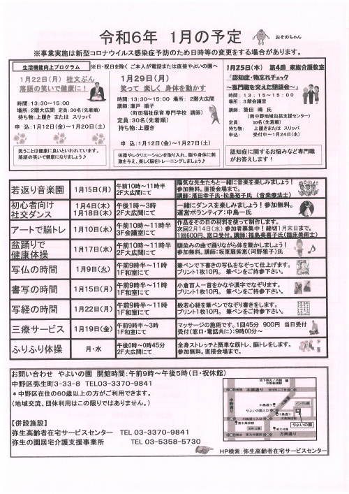 2024.10.05 【弥生の園居宅】東京医科大学病院「訪問看護師・ケアマネジャー交流研修会」 活動報告 2024.10.03 やよいの園 認知症デイ【優っくり屋台村】予告 居宅介護支援事業所 2024.09.30 【弥生の園居宅】秋バテにご注意ください お知らせ 2024.09.30 【弥生の園居宅】やよいの園 10月の予定 お知らせ 2024.09.30 この木なんの木? 居宅介護支援事業所 2024.09.30 やよいの園ポストの場所 居宅介護支援事業所 2024.09.30 パンダ公園 居宅介護支援事業所 2024.09.26 (弥生の園居宅)「若年性認知症を教材とした認知症サポーター養成講座」 活動報告 2024.09.21 【RUN伴+なかの2024】お疲れ様でした! 居宅介護支援事業所 2024.09.12 【RUN伴】2024.9.21 走 り ま す !! 居宅介護支援事業所 2024.08.29 【弥生の園居宅】見守り新鮮情報から エスカレーターでの事故に注意 お知らせ 2024.08.29 【弥生の園居宅】ケアマネを募集しています お知らせ 2024.08.29 【弥生の園居宅】中野区 もの忘れ検診 お知らせ 2024.08.29 【弥生の園居宅】中野区 認知症サポーター養成講座のお知らせ お知らせ 2024.08.29 【弥生の園居宅】やよいの園 9月の予定 お知らせ 1 … 6 7 8 9 10 … 13