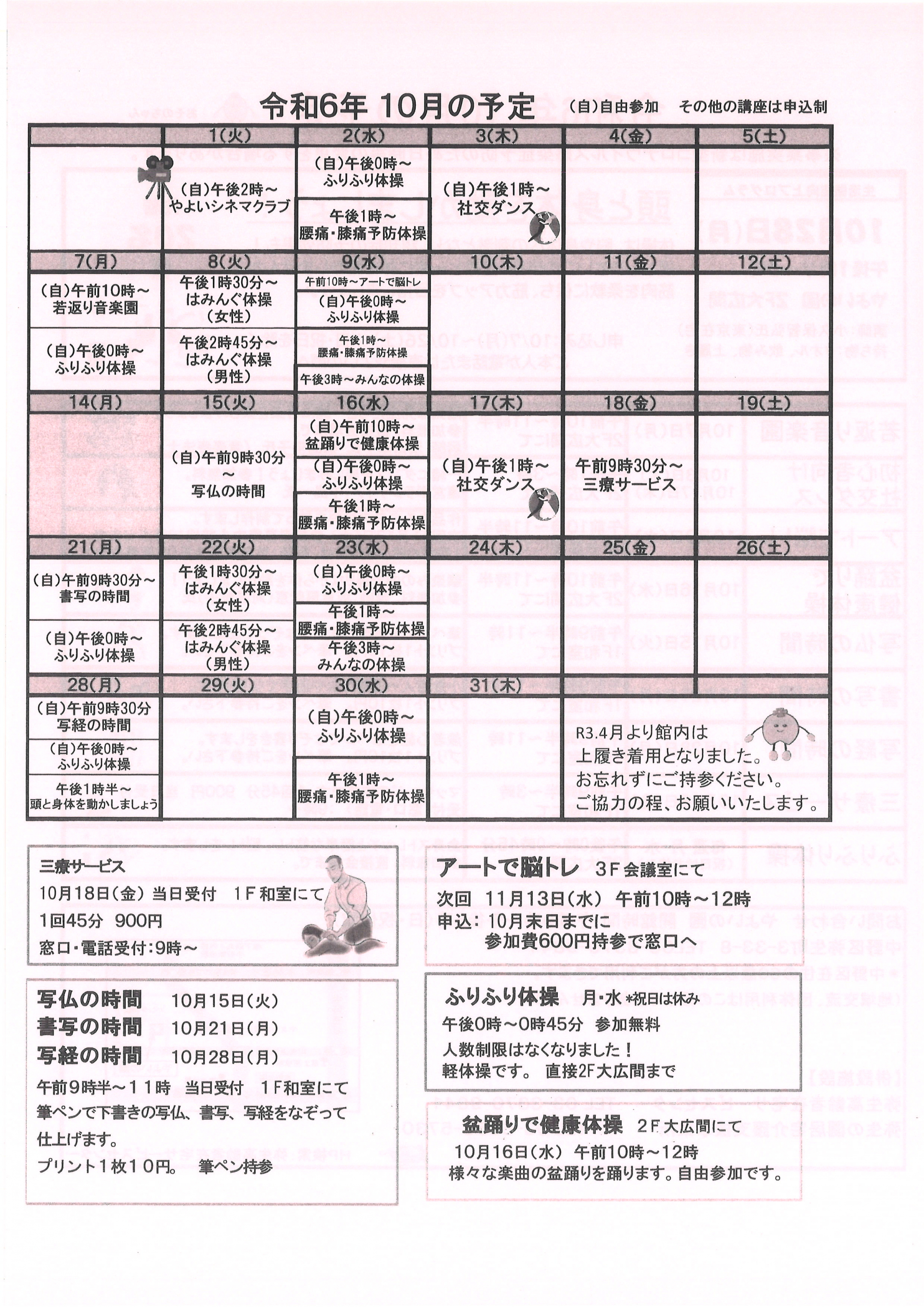 2024.09.30 お知らせ 【弥生の園居宅】やよいの園 10月の予定 Tweet シェアする やよいの園10月の予定です。 10月28日『頭と身体を動かしましょう!』を行います。 申込みは10月7日~10月26日 先着20名様です。 (R.O) 前の記事 2024.09.30 お知らせ 【弥生の園居宅】秋バテにご注意ください 次の記事 2024.09.30 お知らせ この木なんの木? 一覧へ戻る