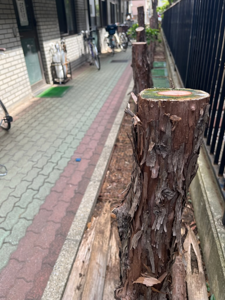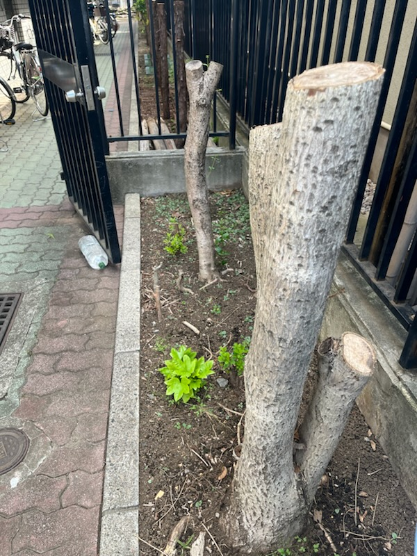 やよいの園の職員用通路横の木が切られています。