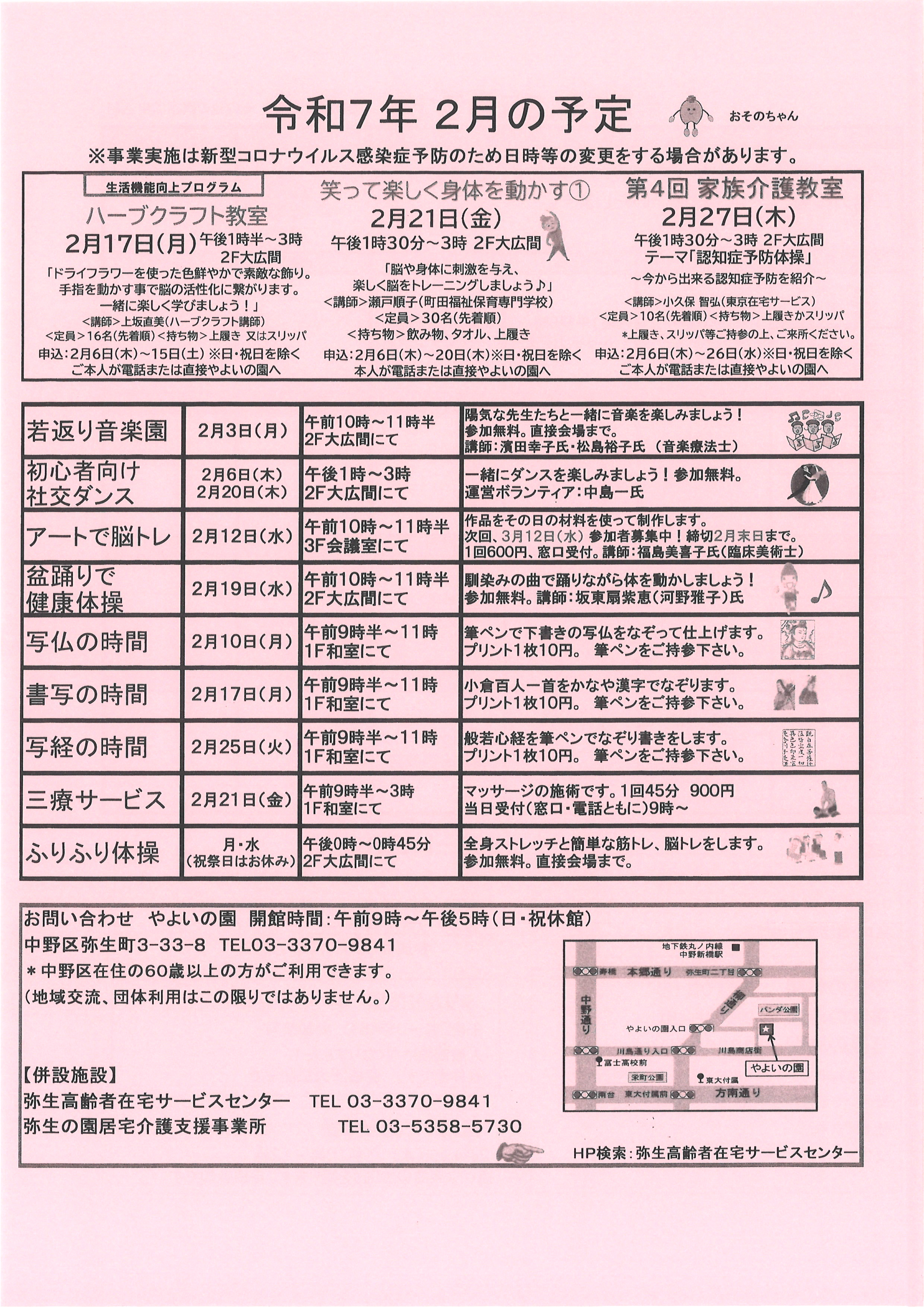 2月17日(月)ハーブクラフト教室、2月21日(金)笑って楽しく身体を動かす、2月27日(木)第4回家族介護教室を行います。