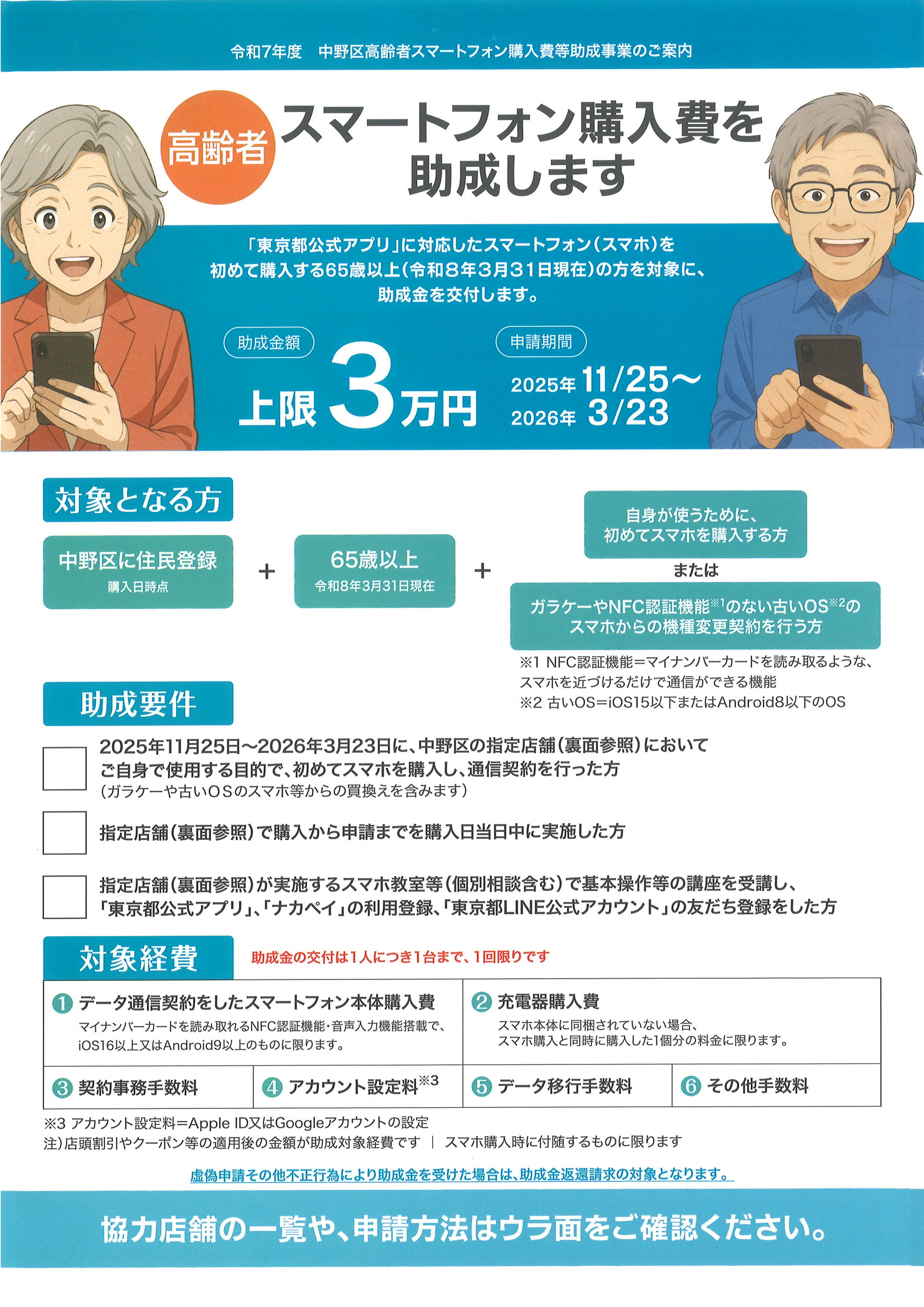 中野区に住民票があり、65歳以上で初めてスマホを購入する方(機種変更の方)は助成要件を満たせば購入費の助成が受けられます!